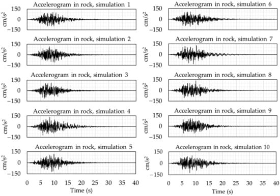 At least five synthetic accelerogram simulations should be performed, including a compatibility check, by performing a comparison between the response spectrum of each simulation and the target spectrum used, showing a match between the results. Figure 6 gives examples of 10 synthetic accelerograms using the reference spectrum ER related to the city of Puebla, as shown previously in Figure 3.