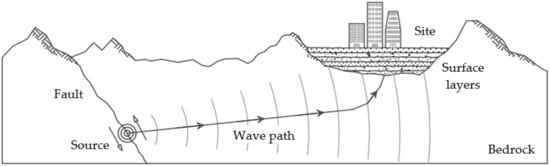 To perform a dynamic analysis of the soil, data on the physical properties of each layer in the site are required, focused on the thickness , the volumetric weight , the shear wave velocity , the damping ratio , and the total depth . The goal is to obtain the dynamic amplification of the seismic waves at the site from the rock layer to the surface layer, according to the different frequencies. Figure 8 shows the seismic wave path from the fault to the site of interest, where the surface layer tends to amplify the seismic wave amplitudes [6].