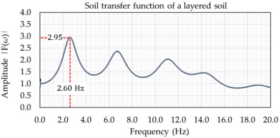 The inputs related to the physical properties of the soil layers and the procedure to obtain the transfer function, , are explained in step 2 previously presented in the site-specific spectrum of the MDOC Sismo CFE 2015 code in Section 3.4. Programs such as DeepSoil [7] or ProShake [8] can be used to create a 1D model of the soil layers to obtain the graph of the transfer function, , by applying linear or non-linear analysis procedures.