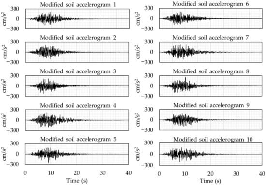 The accelerograms must be modified from a time function to a frequency function, , by applying the Fourier transform technique, performing the mathematical convolution process between the functions and , and then, applying an inverse Fourier transform to return the accelerations as a function of time. DeepSoil [7] and ProShake [8] can perform this mathematical process and obtain scaled accelerograms according to the soil dynamic properties related to the transfer function.