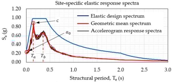 Finally, all the spectral acceleration values, and , must be multiplied by the structural importance factor, , previously determined in Table 3.