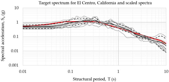 Figure 17 shows an example of a response spectral acceleration graph with a logarithmic scale, taking as a target spectrum the location of El Centro, California, and the scaling results of the selected 10 real earthquakes, including a geometric mean spectrum with a damping ratio of 5%.