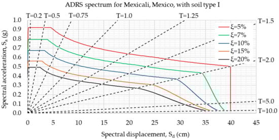 Figure 19 shows an example of the ADRS format, representing the seismic elastic design spectra according to MDOC Sismo CFE 2015 building code, showing the spectral values of Mexicali, Mexico, with a soil type I and different damping values. According to the ADRS format, with a single graph it is possible to obtain the spectral displacements and accelerations of the structure at the same time, where the radial dotted lines represent the period . The process of obtaining each radial line requires the location of a single point using the coordinates and , with both values related to a specific period, ; one can simply draw a straight line from the origin to the point destination.