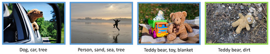 Sentiment analysis is a challenging task because of the diverse set of objects involved and the complex interactions among them. Some researchers have attempted to explore human visual principles using multimodal information and made progress [5,6], but single-modal image emotional classification tasks have developed less. As shown in Figure 1, images that express the same sentiment contain entirely different entities. Simultaneously, as shown in Figure 1, images containing similar objects such as “Teddy bear” express opposite sentiment due to differences in other objects. This indicates that the interaction among objects plays a vital role in visual sentiment. Previous studies focused on how to extract the sentimental features effectively but neglected the interactions. Yang et al. [7] put forward the “Affective Regions”, which are components that convey significant sentiments information, and utilized three fusion strategies for the features from the global context and “Affective Regions”. Alternatively, Wu et al. [8] enhanced the local features of images, employed a saliency detection model, and improved the classification performance by no small margin.
