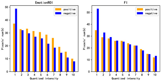 Distribution bar chart displaying the number of brightness pixels of different emotion categories in the EmotionROI and FI dataset.