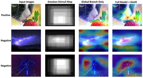 Qualitative results on 3 images from EmotionROI. For each image, the first column from the left is the original input image and the second column is the Emotion Stimuli Map annotated by person, while the third and forth columns are saliency maps from the two models: “Global Branch only” and “Full Model + Distill”. Specifically, blue color indicates low attention weights, while red means the opposite.