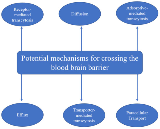 AgNPs along with other metal NPs are able to cross not just the placental barrier but the blood–brain barrier as well [8,9]. Tang et al. [36] proposed two mechanisms of AgNP penetration across the blood–brain barrier, i.e., the transcytosis of endothelial cells of the brain–blood capillary and the reduction in the close connection between endothelial cells, or dissolution of endothelial cell membranes. The main mechanisms of nanoparticles for crossing the blood–brain barrier according to the literature are summarized in Figure 1.