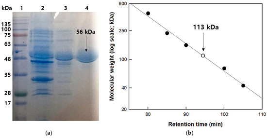 Molecular mass determination of β-galactosidase from T. uzoniensis. (a) SDS-PAGE analysis. Lane 1, molecular weight size marker; lane 2, cell debris; lane 3, crude extract; and lane 4, purified enzyme. (b) Determination of native molecular mass using gel-filtration chromatography. The reference proteins ferritin (440 kDa), catalase (232 kDa), aldolase (158 kDa), conalbumin (75 kDa), and ovalbumin (43 kDa), and purified β-galactosidase from T. uzoniensis are represented by filled circles and open circles, respectively.