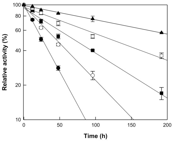 Thermal inactivation of β-galactosidase from T. uzoniensis. The enzyme was incubated at 75 (closed triangle), 80 (open square), 85 (closed square), 90 (open circle), and 95 °C (closed circle) in 50 mM CPB (pH 5.0) for different time periods and the residual activity was determined. Data are represented as the means of thriplicate experiments and error bars represent the standard deviation.
