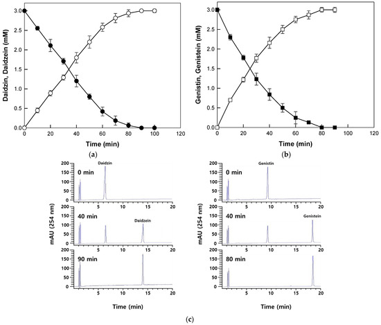 The enzyme completely hydrolyzed 2 mM reagent grade daidzin and genistin to daidzein and genistein within 90 min and 80 min, respectively (Figure 4a,b). The HPLC profiles for the conversion of daidzin and genistin into daidzein and genistein are shown in Figure 4c. The productivities for daidzein and genistein corresponded to 1.33 and 1.50 mM/h, which were 3.1- and 2.5-fold higher than those achieved with β-glucosidase from P. furiosus for isoflavone aglycones from soybean flour extract [13]. Therefore, β-galactosidase from T. uzoniensis was further applied to the production of isoflavone aglycones from extracts of Korean wild soybean.