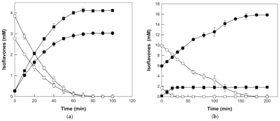 The time-course reactions for the production of daidzein and genistein from daidzin and genistin in the extracts were carried out at pH 5.0 and 90 °C with 20% (w/v) seed or root extract, and 0.4 mg/mL β-galactosidase from T. uzoniensis. The seed and root extracts at 20% (w/v) contained 6.62 mM and 11.56 mM isoflavone glycosides (2.77 mM daidzin and 3.85 mM genistin, and 9.89 mM daidzin and 1.67 mM genistin) as substrates and 0.53 mM and 6.08 mM of the corresponding aglycones (0.26 mM daidzein and 0.27 mM genistein, and 5.95 mM daidzein and 0.13 mM genistein), respectively. Daidzin and genistin in the seed extract were completely hydrolyzed to daidzein and genistein within 80 and 70 min, corresponding to the productivities of 1.86 and 3.30 mM/h, respectively. Daidzein and genistein were produced from daidzin and genistin in the root extract with higher productivities of 3.30 and 3.36 mM/h, respectively, and molar yields of 100%, after 180 min and 30 min, respectively (Figure 5).