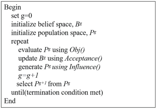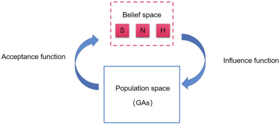In fact, the population space can support any population-based evolutionary algorithm or swarm intelligence algorithm, which can also interact and run simultaneously with the belief space. The standard cultural algorithm has only a single mutation operator in the population space, making its global convergence and exploration capability insufficient. The GAs has a strong global search capability and high robustness, which can effectively explore the search space with the increasing population convenience and global exploration capability of the algorithm, and thus the population space is evolved using the GAs in this paper. A detailed description of the genetic algorithms is given in Section 2.2 and will not be repeated here.