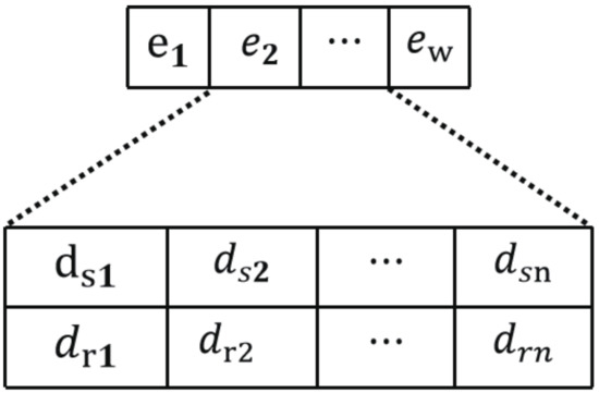 - Historical knowledge. Historical knowledge was introduced into the belief space by Saleem [31] to record important events that occurred during the evolutionary process, and its main role is to adjust the offset distance and direction when the optimization falls into a local optima. The historical knowledge structure is divided as shown in Figure 4, where is the ith outstanding individual of historical knowledge preservation, W is its maximum capacity, and and are the average offset distance and the average offset direction of the jth design variable. The expressions of and are as follows:
