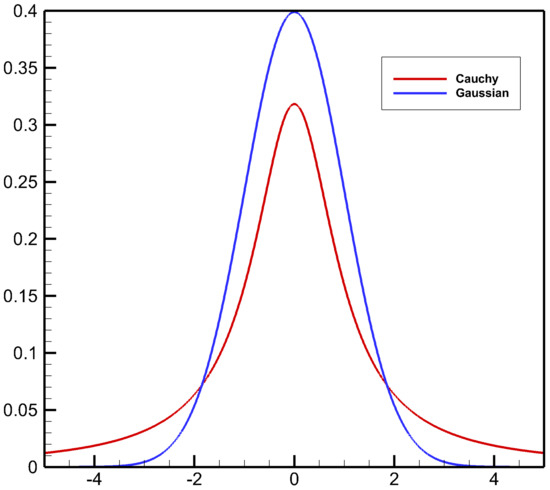 Evolutionary algorithms require good exploration capabilities in the early stages and good exploitation capabilities in the later stages of evolution. The t distribution contains the degree of freedom parameter n, which approaches the standard Gaussian distribution infinitely when and the t distribution is the standard Cauchy distribution when . That is, the standard Gaussian distribution and the standard Cauchy distribution are two boundary special cases of the t distribution. The probability density functions of the standard Gaussian distribution and the standard Cauchy distribution are shown in Figure 5. Obviously, the application of the Cauchy operator can produce a larger mutation step, which is conducive to the algorithm to guide individuals to jump out of the local optimal solution and ensure the exploration ability of the algorithm, and Gaussian distribution shows a better exploitation ability.