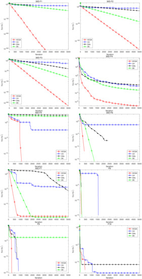 As can be seen from Figure 6, HCGA shows a better performance for most functions. For unimodal functions, the convergence speed and accuracy of HCGA are significantly better than those of other algorithms. For multimodal functions, HCGA is able to achieve higher optimization accuracy in shorter iterations for all functions except for function , which was slightly inferior to GAs and DE in terms of convergence speed in the initial search stages. This means that HCGA not only has good search ability and fast convergence, but also moderates quite well the conflict well between convergence speed and premature convergence, which means that it has a balanced exploitation and exploration ability.