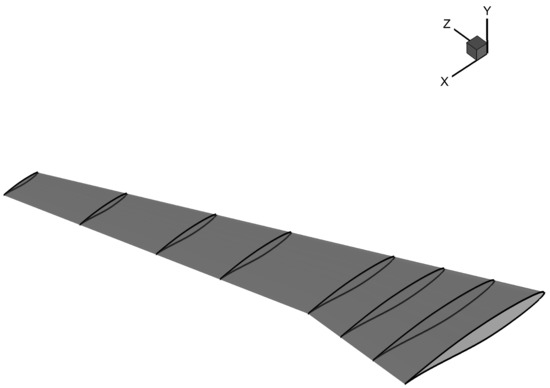 In this design, eight sections were used to describe the whole wing geometry for its shape optimization, its configuration and control surface distribution, as shown in Figure 7. The parameterization method described in Section 5.1 was used to control the wing shape, with a total of 72 design variables. The optimal design of the wing for the cruise factor was considered in the cruising condition at the flow condition of Mach 0.785, a angle of attack and a Reynolds number of based on the aerodynamic mean chord. HCGA was used to optimize the shape with a population size of 150 and evolutionary iterations of 100. The objective was to maximize the cruise factor, and the constraints were that the maximum thickness of each control surface and the lift coefficient should not to be reduced. The mathematical optimization model is described as follows: