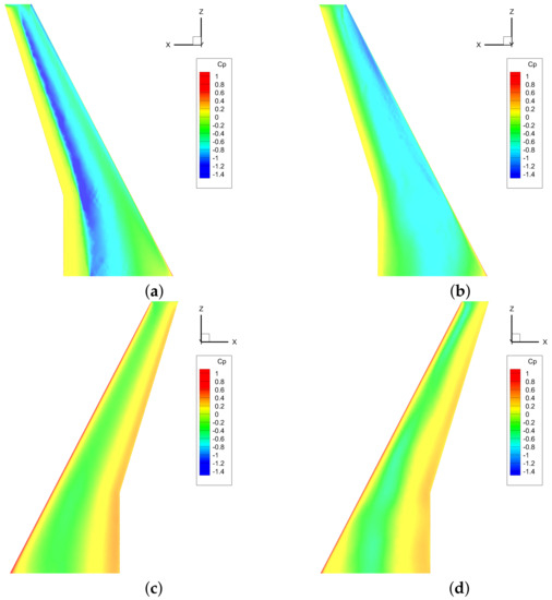 (a) Pressure coefficient contours on the wing upper surface of the initial wing; (b) Pressure coefficient contours on the wing upper surface of the optimized wing; (c) Pressure coefficient contours on the wing lower surface of the initial wing; (d) Pressure coefficient contours on the wing lower surface of the optimized wing.