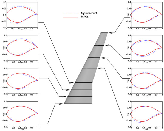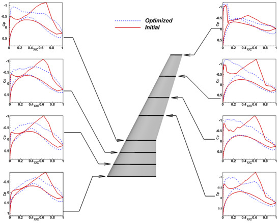 where is Mach number, L is lift, D is drag, is the maximum thickness of the ith section, is the maximum thickness of the initial control surface, is the lift coefficient and is the lift coefficient of the initial wing. The flow was modeled by the compressible full potential flow with viscous boundary layer correction, and the total number of mesh points was about 0.5 million. The pressure coefficient contours on the upper and lower surface of the initial and optimized wing are shown in Figure 8. The respective pressure distributions at each section are shown in Figure 9 and the wing section shapes before and after optimization are compared in Figure 10. It is seen that the shock waves were significantly smeared owing to the shape modification, which resulted in a considerable reduction of wave drag on the upper surface and therefore in better aerodynamic performance. The aerodynamic parameters of the wing before and after optimization are shown in Table 9. The cruise factor was significantly increased from 21.863 to 26.938 because the drag coefficient of the optimized wing was obviously reduced from 0.01605 to 0.01302. It can be seen that the cruise factor increased by 23.21%, while the drag coefficient decreased by 18.88% and the constraints of lift coefficient and thickness were satisfied. There was also no significant change in the induced drag coefficient since there was no change in the lift coefficient . The wave drag coefficient of the wing was reduced apparently from 0.00240 to 0.00030, and the profile drag coefficient was also reduced from 0.00680 to 0.00602.