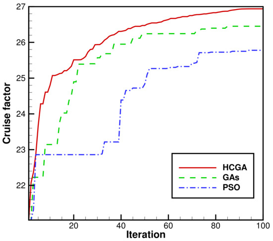 For a better comparison of values with the proposed HCGA algorithm in this engineering application, the commonly used GAs [11] and PSO [37] of the engineering optimization field were selected for comparison with HCGA. The parameter settings of HCGA were the same as for the numerical experiment, and all parameters of GAs and PSO were default parameters. The population size and maximum number of iterations for all three algorithms were 150 and 100, respectively. The cruise factor convergence curve is shown in Figure 11.