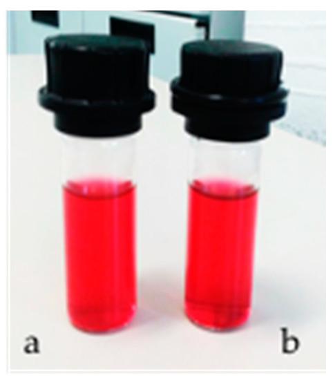 Red prickly pear juice at (a). pH = 7 and (b). pH = 3.6.