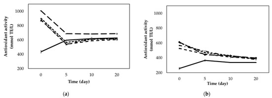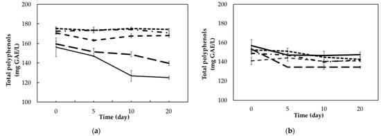 Chemical analyses showed that the total polyphenol content in untreated juice at pH 3.6 (Figure 2a) and 7 (Figure 2b) decreased significantly (p < 0.05) during storage, with contents of 159.32 and 153.18 mg GAE/L at day 0, respectively. The juice treated at day 0 by UV-C irradiation showed contents of 170.88 mg GAE/L (31.87 mJ/cm2) and 175.32 mg GAE/L (9.81 mJ/cm2), and HTST contents of 156.12 mg GAE/L for juice at pH 3.6. UV-C treatment showed values of 140.81 (31.87 mJ/cm2) to 152.38 mg GAE/L (9.81 mJ/cm2), and UHT treatment showed values of 156.98 mg GAE/L for juice at pH 7. Treated juices (UV-C, HTST, and UHT) did not show changes in polyphenols contents from day 5, observing differences only in pH. Moldovan et al. [40] indicated the importance of pH with regard to polyphenols, and oxidative degradation was more stable at pH levels below 5. UV-C irradiation did not significantly affect (p > 0.05) the total polyphenol content of the evaluated juices. However, it has been reported that while the content of some polyphenols is reduced, the content of others increases, both changes due to photooxidation or photoinduced molecular rearrangement [41], so the change will not be observed in the total quantification. Additionally, the UV-C system used is derived in a short time of exposure that minimizes the changes in bioactive compounds, as has been reported by Rodríguez-Rodríguez [18]. Caminiti et al. [42] report similar behavior in apple juice treated with doses in the range of 2.66 to 53.10 J/cm2. However, a decrease of 21.3% of polyphenol content was observed on day 20 in the thermally treated (HTST 80 °C) prickly pear juice at pH 3.6, this due to the polyphenols being considered thermolabile compounds. Santhirasegaram et al. [43] investigated mango juice treated at 90 °C for 60 s and reported a 38% loss in total polyphenols. This was re-evaluated after five weeks of storage at 4 ± 1 °C, with no significant change in polyphenol content.
