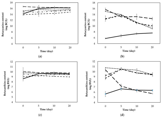 Thermal treatments significantly affected (p < 0.05) both betalains. Both HTST and UHT treatments resulted in diminished pigment content. HTST treatment (80 °C/30 s) reduced (p < 0.05) the 14.83% of betacyanins and 14.39% of betaxanthins compared to the untreated juice. UHT also significantly decreased (p < 0.05) betacyanin and betaxanthin contents by 63.09 and 45%, respectively, in comparison with untreated juice. Processing at high temperatures causes hydrolysis, generating betalamic acid and cyclo-dopa-5-O-glucoside [5]. However, betalains increased from day 5, caused by betalain regeneration due to the hydrolysis occurring due to the high temperature, which could be partial in the bond of betalamic acid, and therefore this bond can be conjugated with precursor amino acids, such as proline [45]. Additionally, after storage, the content of pigments at pH 3.6 reaches the UV-C treatments by the partial regeneration of betalains when exposed to optimal storage conditions [39]. Jiménez-Aguilar et al. [7] investigated a drink based on crystalline prickly pear and red prickly pear, treated with an unconventional method of high hydrostatic pressure (550 MPa/tC 2 min), in comparison with an ultra-pasteurization (UHT) treatment at 138 °C for 2s. UHT treatment resulted in considerable losses of 7 to 45% for betaxanthins and 18 to 26% for betacyanins. However, the unconventional treatment significantly increased the betaxanthin (6–8%) and betacyanin (4–7%) contents, emphasizing the need for alternative non-thermal processing.