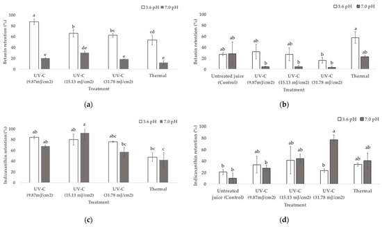 Effect of UV-C irradiation and thermal treatment (HTST or UHT) on betalain retention (%) of red prickly pear juice at pH 3.6 and 7 during storage: (a) betanin day 0 (b) betanin day 20 (c) indicaxanthin day 0 (d) indicaxanthin day 20. For each figure panel, different letter indicate significantly different mean (p < 0.05), by Tukey’s test.