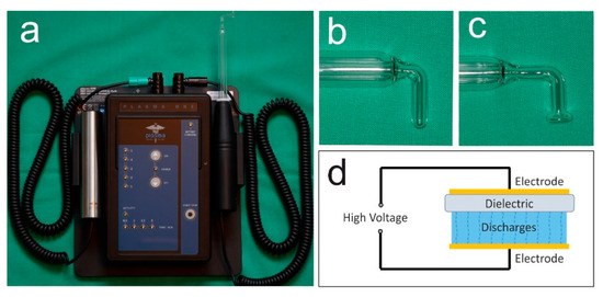 Ambient-air NIPP was generated by a dielectric barrier discharge (a) plasma ONE Dental (plasma Medical Systems GmbH, Nievern, Germany); (b) instrument probe PS08; (c) instrument probe PS12; (d) principle of dielectric barrier discharge.