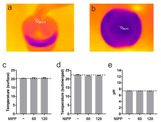 First, we wanted to prove that NIPP has no negative effects on cells and tissues. At room temperature the PS30 probe runs with a certain surface temperature of 24.7 °C (Figure 4a). The measurement of the surface temperature and the core temperature of the cell culture medium showed no change due to the application of NIPP (Figure 4b–d). Neither was there any change in the pH value (Figure 4e). For this reason, damage to the treated cells and tissues could be ruled out.