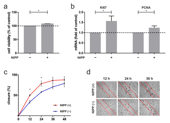 The 60 s NIPP treatment of primary human gingival keratinocytes (HPGK) at one day. (a) Influence of NIPP on cell viability, shown by XTT assay, n = 6; (b) impact of NIPP on mRNA level of proliferation markers Ki67 and PCNA, n = 6; (c) in vitro wound healing assay, displayed by scratch assay, n = 5; (d) representative images are visualized. * statistical significance (p < 0.05).
