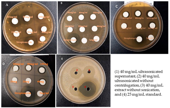 Antibacterial activity of different concentrations of nanoparticles (supernatant) of garlic extract against S. mutans (A), P. gingivalis (B), S. aureus sub. aureus (C), and E. coli (D) by agar disk diffusion method. (E) represents the antibacterial effect of 40 mg/mL garlic extract treated in different conditions against P. gingivalis by the agar well diffusion method.