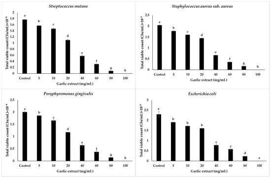 Results showing the total viable counts of all tested bacteria in colony-forming units per millimeter (CFU/mL) post interaction with the garlic extract and bacteria broth culture are illustrated in Figure 2. The results proved that all tested bacteria were challenged by the garlic extract during overnight incubation and led to a high reduction in cell number of S. mutans at 100 mg/mL. S. mutans decreased from 1.77 × 104 CFU/mL (control) up to 0 CFU/mL, P. gingivalis showed a decline from 2.01 × 104 to 0 CFU/mL, S. aureus sub. aureus reduced from 2.05 × 105 CFU/mL to 0 CFU/mL, and the most resistant bacteria E. coli, decreased to 0 CFU/mL when tested with 100 mg/mL concentrations, compared to the control (2.03 × 105 CFU/mL).