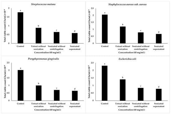Briefly, the effect of sonication on the antibacterial capacity of the garlic extract in the reduction of total viable counts when bacteria were tested against 40 mg/mL treated in different conditions was reported in Figure 3 and indicated that the sonicated supernatant garlic extract significantly reduced the total viable bacteria counts compared to other types of garlic extracts.
