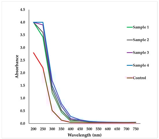 Microplate spectrophotometer absorption of nanoparticles of the garlic extract prepared using various sonication time and power (Sample 1, 2, 3, 4: sonicated samples, control: unsonicated sample).