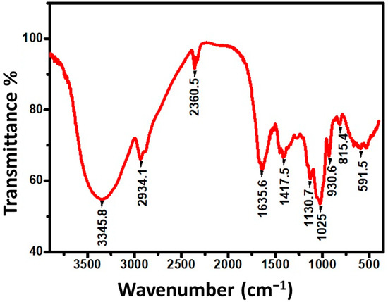 FTIR spectroscopy was used to discover the successful extraction of garlic nanoparticles, and spectra were obtained in the wavenumber range of 500–3500 cm−1. The results of the FTIR spectrum of the ultra-sonicated garlic extract showed visible peaks at around 3345.8, 2934.1, 2360.5, 1635.6, 1417.5, 1130.7, 1025, 930.61, 815.4, and 591.5 cm−1 wavenumbers (Figure 5).
