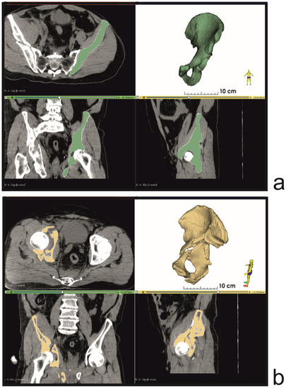 Bone tissue segmentation and virtual 3D models (a) uninjured contralateral side (b) injured side of the pelvis.