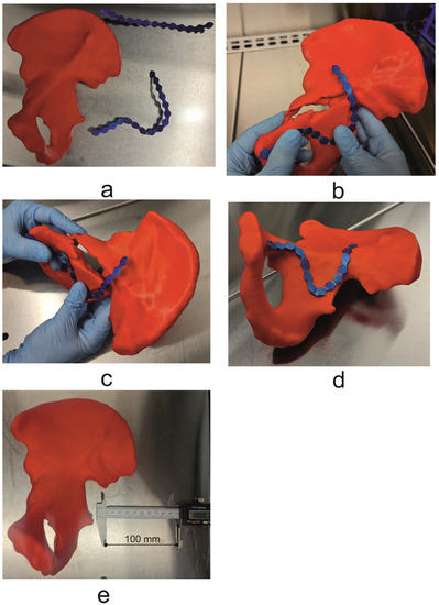 (a) Mirrored uninjured hemipelvis with bending template, (b,c) process of shaping and fitting bending template to the patient’s unique anatomy, (d) final shaped bending template, (e) 3D model with scale bar (100 mm).