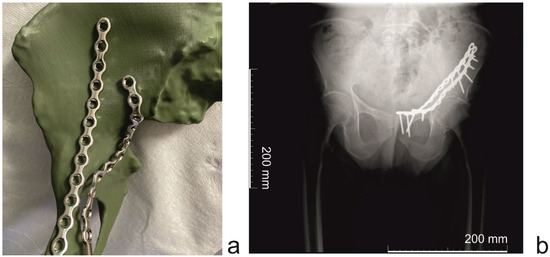(Patient 3) (a) Mirrored uninjured hemipelvis with reconstruction plates (b) (Patient 4) Post-operative X-ray image (scale bar = 200 mm).