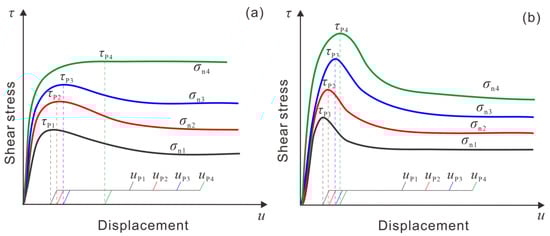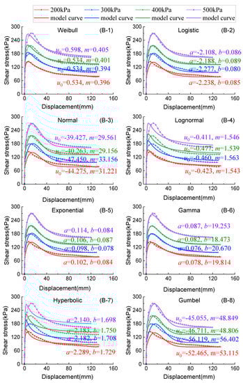 - The fitting result of Gumbel-constitutive model shows that the peak displacement of the model for type B was greater than the actual peak displacement (Figure 10(B-8)). The fitting correlation coefficient increases from 0.717 to 0.928 as the normal stress increased (Figure 11b). The peak displacement of model curves for type A was also larger than the actual peak displacement (Figure 9(A-8)), but the peak displacement offset increased with the increase of normal stress.