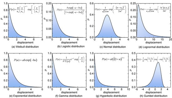 - The shear constitutive models based on Gamma distribution, Exponential distribution, and Logistic distribution are the best three models for the strong softening curve; the shear constitutive models based on Gamma distribution, Weibull distribution, and Exponential distribution are the best three models for the weak softening curve. The results demonstrate that the Gamma distribution is the best distribution to reflect the damage evolution process of the slip zone soil;