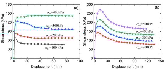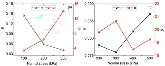 - The fitting correlation coefficients (R2) of Logistic-constitutive model for type A curves were 0.821, 0.792, and 0.892 (Figure 11a). For type B curves, the fitting correlation coefficient increased from 0.831 to 0.978 as the normal stress increased (Figure 11b), which is better than that of type A curves. Parameter a increased with the increase of softening degree, but the influence of softening degree on parameter b was not clear;