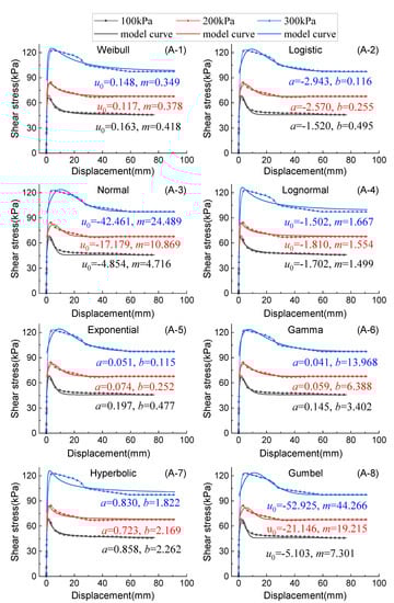 - The commonly used Weibull-constitutive model has a good fitting result in the weak softening curve, but it is not the optimal model. In the strong softening curve, the fitting result of the Weibull-constitutive model is poor, and the Weibull-constitutive model is not suitable for this kind of shear curve;