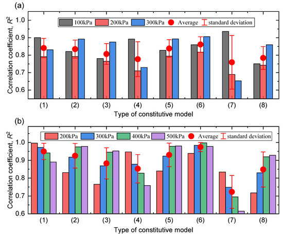 - Among the Hyperbolic-constitutive model, the fitting result of type A under normal stress 100 kPa was better, and the correlation coefficient was 0.936 (Figure 11a), but the characteristics of the model curves for type A under high normal stress and the model curves for type B (Figure 9(A-7) and Figure 10(B-7)) were similar to the Lognormal-constitutive model;