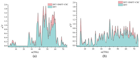 Eliashberg function for (a) LaH and (b) LaH; the spectral weight at the Fermi level is calculated with different extents of approximation: (i) DFT and (ii) with the full-charge self-consistent formalism (DFT + DMFT + CSC).