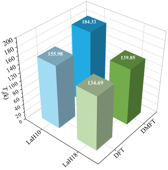 A comparison between Figure 4a–c shows that the one-shot (DFT + DMFT) and the full-charge self-consistent method (DFT + DMFT + CSC) barely change the -La spectral weight at the Fermi level. This leads to similar results for the superconducting temperature of LaH within DFT, one-shot DFT + DMFT, and DFT + DMFT + CSC approaches. By looking at Figure 3 and Figure 4, it can be seen that the f orbital DOS modifications within DMFT with respect to DFT are different for different hydrogen content. For LaH, DFT significantly overestimates the -La weight at the Fermi level, while for LaH, the -La weight is low both in DFT and DMFT, leading to a lower .