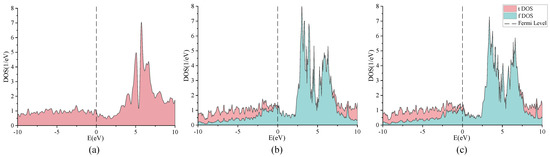 As shown in Figure 3a, the La compound is represented by a two-band system in the absence of a long-range magnetic order in DFT calculation. DFT formalism uses a single Slater determinant model and consequently fails to capture any paramagnetic effects, with an associated magnetic multiplet (fluctuating magnetic moment). These effects usually cause a splitting of spectral features into satellites, as seen in Figure 3b,c, with a resulting enforcement of the f character at the Fermi level. We established that since sharp La features exist at the Fermi level, a greater degree of theoretical modeling is necessary to correctly reflect the superconducting characteristics. In the conducted analysis, for example, the one-shot (DFT + DMFT) and the full-charge self-consistent method (DFT + DMFT + CSC) generate a minor shift of the acute La feature at the Fermi level, which reduces the f character weight at the Fermi level.