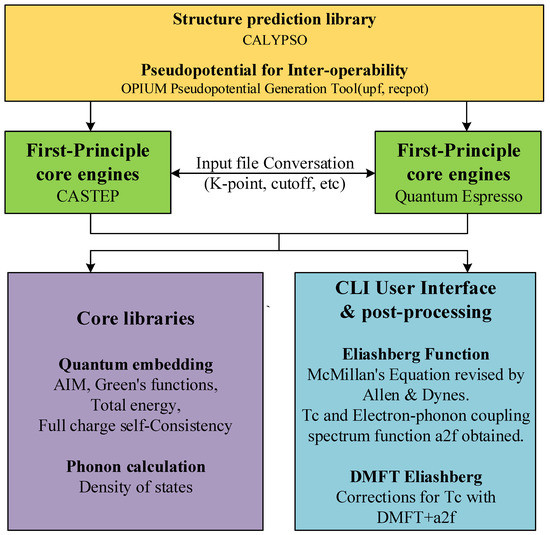 Schematic of the workflow for DFT + DMFT interfaced with Allen–Dynes. Outline of the theoretical platform’s core modules and their interrelationships. To begin with, structures are modeled by crystal structure analysis by particle swarm optimization (CALYPSO), and the pseudopotentials are generated with OPIUM. The main core engines are CASTEP and QE DFT software. We have used format conversion of input files, pseudo-potentials, and K-point grids to ensure interoperability between QE and CASTEP. We employed core libraries to provide many-body corrections using quantum embedding, which also provides updated values for the forces and energies. During the post-processing phase, we used the DMFT + a2F approach to obtain values for the Eliashberg function and superconducting temperature . As a final step, data was archived for future usage using HDF5.