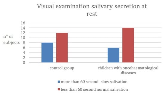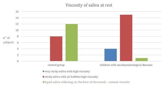 Figure 2, below, reports data collected on the viscosity of saliva at rest; children with oncohematological diseases had having higher-viscosity saliva compared to the control group. This relationship was significant (see Table 2 further in the Results section).