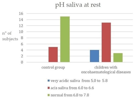 In another study carried out in 2017 by Mazaheri et al., apparently healthy children and children with oncohematological diseases of the same age and belonging to the same socioeconomic status were compared. Sampling was undertaken to determine the salivary pH of the participants. It was observed that between the two groups, children with oncohematological diseases had a higher susceptibility to caries and a lower salivary pH [14]. The same results were found by Hedge et al. [15] and in this work, comparing apparently healthy children and children affected by oncohematological diseases. The data in the present work showed that in the control group, 75% had a saliva pH of 6.8 to 7.8 (normal saliva). In contrast to the latter, only a few children in the other group had non-acidic saliva, with the majority having an acidic salivary pH between 6.0 and 6.6. A total of 20% had very acidic saliva with a pH ranging from 5.0 to 5.8 (Figure 3). Moreover, using salivary tests, it was possible to assess that 60% of the sick children had a low buffering capacity in their saliva and 20% had a rather low capacity, compared to the control group, where 55% of the children showed a low capacity to neutralize acids and 45% a normal capacity. Furthermore, by analyzing the pH, it was possible to observe a higher acidity of the saliva at rest in the group of children suffering from oncohematological pathologies, who have a greater predisposition to dental caries. It can therefore be deduced that the studies reported in the literature are confirmed by the development of this study, since the low production of saliva leads to a decrease in the buffering effect, poor cleansing of the oral cavity, and a weakening of the mucous membranes. These factors, combined with a change in the oral microbial flora, are responsible for an increased risk of cavities.