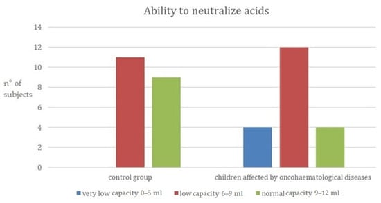 In a survey conducted in 2010 by Ou-Young et al., whose aim was to assess the caries activity of children with oncohematological diseases, a group of apparently healthy children and a group of sick children were sampled and compared. Using salivary tests, stimulated saliva samples were collected, and their buffering capacity assessed. The results of these tests show that the group of children with oncohematological diseases had a lower salivary buffer capacity than the control group [13], confirming the findings of the present study, where, in the group of children affected by oncohematological diseases, 20% had very low capacity, between 0 and 5 (Figure 4).